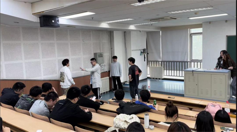 然后进行的是驿站传书,由前面同学表演给后面的同学,只能用动作转递,不允许说话。最后由最后一名同学猜词是什么。第一组由吴宜润、崔越、岳知上、肖景誉。他们的词语是唇亡齿寒。第二组由赵岱,宋嘉弘,刘子瑞,岳知上,姚昊辰五位同学参与,他们的词语是五体投地,同学们表演的极为卖力,全场气氛在此时达到顶点。