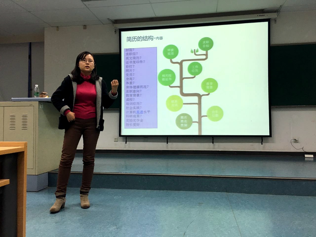 讲座上,姜老师通过风趣幽默的例子,告诫同学们必须要有自己明确的目标,对自己今后的职业发展有清晰的定位,铭记:“行业+职业=职位”,做到术业有专攻,在自己明确的职业领域做深做精。同时,她以简历的“从无到有、从有到好、从好到优”为主线,介绍了简历制作的技巧,例如:简历最好发送PDF格式,避免在投递电子版时出现格式错乱;纸质简历应将重点放在右半页,避免将有利信息错置于视觉死角等等,希望同学们能把简历做到既彰显个性化,又真实、诚恳的突出差异化。