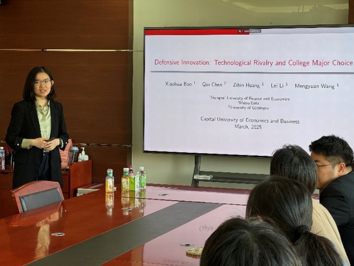 3月12日,李蕾教授作了题为《防御性创新:技术竞争背景下的高等教育专业选择》(《Defensive Innovation: Technological Rivalry and College Major Choice》)的学术报告。报告通过分析中美贸易战中高校招生数据发现,美国对华高科技产品关税每提升1%,将导致STEM专业(特别是工程类)录取分数显著提高2-3%,这一“防御性创新”效应源于受制裁行业研发投入增加和政府补贴强化所带动的高技能人才需求激增。