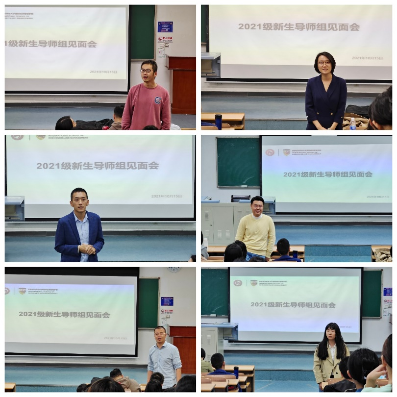为进一步做好“三全育人”,在学生培养中充分发挥教师的主导作用和学生的主体作用,提高人才培养质量,国际经管学院本学期开始继续推行本科导师组制。2021年10月15日上午10点到11点,学院在博学楼阶六教室召开了2021级新生导师组师生见面会。会议由本科教学副院长高静老师主持,学院32名全职教师及全体2021级本科新生参会。会上首先由高静老师介绍学院本科导师组工作和后续安排,然后请全体参会教师一一进行了自我介绍,包括教师教育背景和教学与科研领域等各方面,老师们对同学们表达了亲切的问候以及对大家未来发展的期许。会议第三个环节是由各组导师带领本组学生进行分组讨论。本届本科新生共分11个导师组,每个导师组五名学生配有四位不同专业领域的导师。在分组讨论中,导师们对本科新生进行了叮嘱并与大家进行了学习和校园生活等多方面交流,师生互留了联系方式。