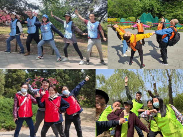 当日清晨,参加活动的教职工在国家植物园东南门统一集合并进行破冰,随机组成“国际经管1队”“海纳百川”“小蜜蜂”“大V队”四支小分队,并通过小程序“线下徒步走,线上云长征”。活动以红军长征历史为背景,模拟行走长征路,通过线下GPS定位打卡,完成在“瑞金、遵义、大渡河、泸定桥”等坐标点的关键任务并上传,如长征知识问答、演唱《没有共产党就没有新中国》等红色歌曲、团队协作拍摄“拉手过草地”照片、集体朗诵《七律●长征》等红色诗歌朗诵......通过完成在长征路途中设置的拓展项目,团队成员集体讨论,分工合作,加强了团队成员之间的沟通和互动,增强团队协作精神,培养了信任感和集体合作能力;通过学习党史知识,感悟伟大长征精神,汲取强大前行力量,厚植爱国主义情怀。