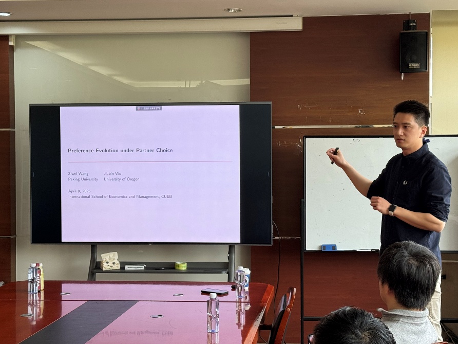 4月9日,王子伟老师为我院师生作了题为《配对选择中的偏好进化》(《Preference Evolution under Partner Choice》)的学术报告。报告研究了内生匹配下的偏好演化:短期中个体主观偏好影响社交互动中的伴侣选择与行为,进而决定物质收益并驱动长期偏好进化。分析表明,内生匹配会进化出兼具亲缘偏见与高效合作能力的稳定偏好,这些偏好通过促成同类匹配与联合收益最大化占据优势;而在信息不完全时,狭隘主义等强亲缘偏见能通过强化自我分类动机成为演化稳定的关键。