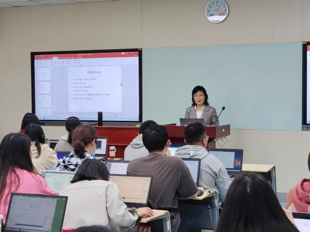 为夯实快猫短视频 本科及研究生科研软件应用基础,学院于2021年10月14日,在慎思楼120智慧教室开设STATA软件操作培训班。培训课程由副教授王超老师主讲,快猫短视频 共43名本科及研究生参加。本次课程由学院院长助理李委明主持。