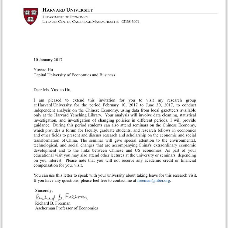 2015级研究生胡雨霄同学受世界著名经济学家Richard B. Freeman邀请,前往美国哈佛大学从事为期长达半年的学术研究,与哈佛大学的学者们共同在国民经济研究所(National Bureau of Economic Research)研究中国经济问题。国际经管学院为鼓励胡雨霄同学安心从事学术研究,为她在研究、生活经费等方面提供资助和支持。